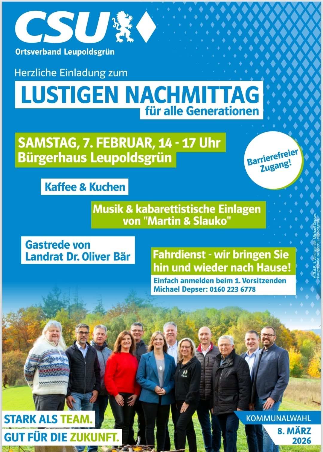 Die CSU Leupoldsgrün lädt alle Interessierten herzlich zum diesjährigen Heringsessen ein. Dieses findet am 25.2.2026 ab 18 Uhr im ASV-Sportheim in Leupoldsgrün statt. Als Redner werden dieses Jahr Rüdiger Strobel (CSU-Bürgermeisterkandidat Stadt Selbitz), Landrat Dr. Oliver Bär und die Leupoldsgrüner Bürgermeisterin Annika Popp erwartet. Die Heringe sind für alle Gäste kostenlos.